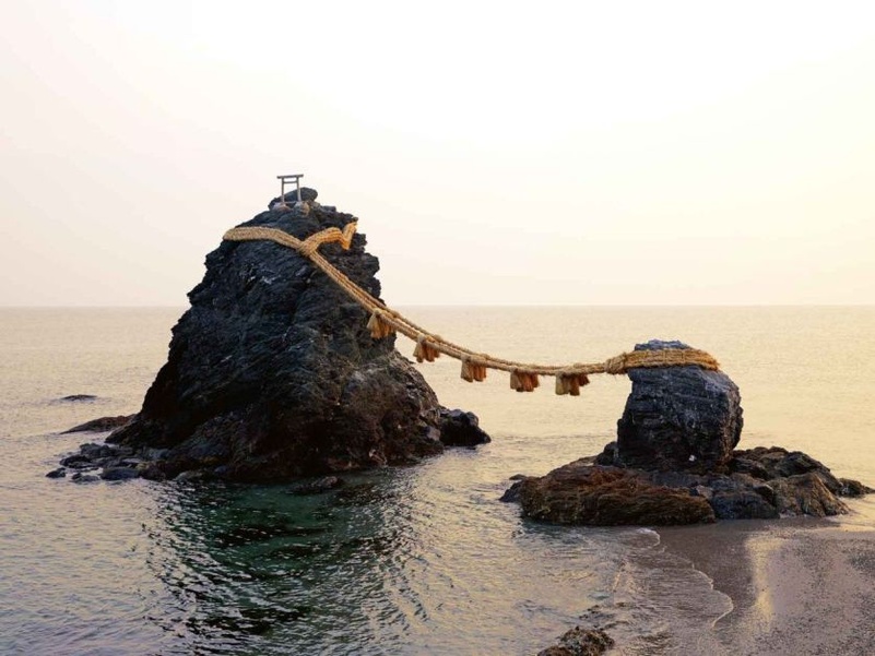 Скалы-супруги Мэото-ива, связанные священной веревкой.