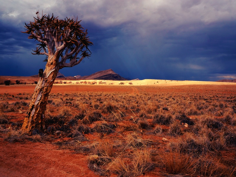 Пустыня Намиб – это самая яркая и важная достопримечательность Намибии. Она создана природой около ста миллионов лет назад, задолго до появления человека на Земле. Протяженность пустыни Намиб более полутора тысяч километров вдоль Атлантического побережья. Намиб подходит вплотную к самому берегу Атлантического океана, это, наверное, один из самых экзотических и длинных диких “пляжей” в мире. Большая часть пустыни является природоохранной зоной и называется национальным парком Намиб-Науклюфт. Здесь встречаются уникальные черные скалы, цветные барханы, красивая серая галька и разноцветные пески. Красные, оранжевые и золотые пески пустыни Намиб-Науклюфт создают неповторимый и удивительный ландшафт, чем-то напоминающий марсианский пейзаж. Здесь практически нет населенных пунктов, лишь пара маленьких поселений и несколько туристических отелей. Пожалуй, это единственное место в мире, где в пустыне можно увидеть дерево, которое умерло еще тысячу лет назад. Намиб – одна из самых засушливых пустынь на нашей планете, растения здесь вынуждены адаптироваться к такому суровому климату, поэтому в Намибии можно встретить деревья и кустарники самых причудливых форм.