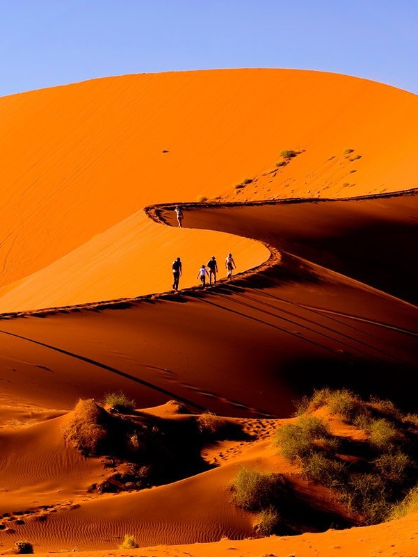Экскурсия начинается рано утром, на рассвете. Здесь вы можете подняться на самые высокие в мире дюны, совершить прогулку к «мертвой долине», где увидите на дне белого солончака выжженные ярким африканским солнцем деревья. И все это – в окружении высочайших песчаных оранжевых дюн под синим небом. Величественные красные дюны являются достигают 400 метров в высоту. Краски здешних мест просто поражают воображение – от темно-бордовых, красных, оранжевых на рассвете и закате до золотистых и розовых оттенков песков днем. Белые солончаки и мертвые деревья в «Долине смерти» на фоне кристально-чистого синего неба останутся в вашей памяти на всю жизнь. А в сезон дождей на плато Соссусфлей красок становится еще больше, наливаются реки, зеленеют деревья. Здесь снято огромное количество красивейших фотографий и фильмов, которые демонстрируют удивительные красоты африканского континента.