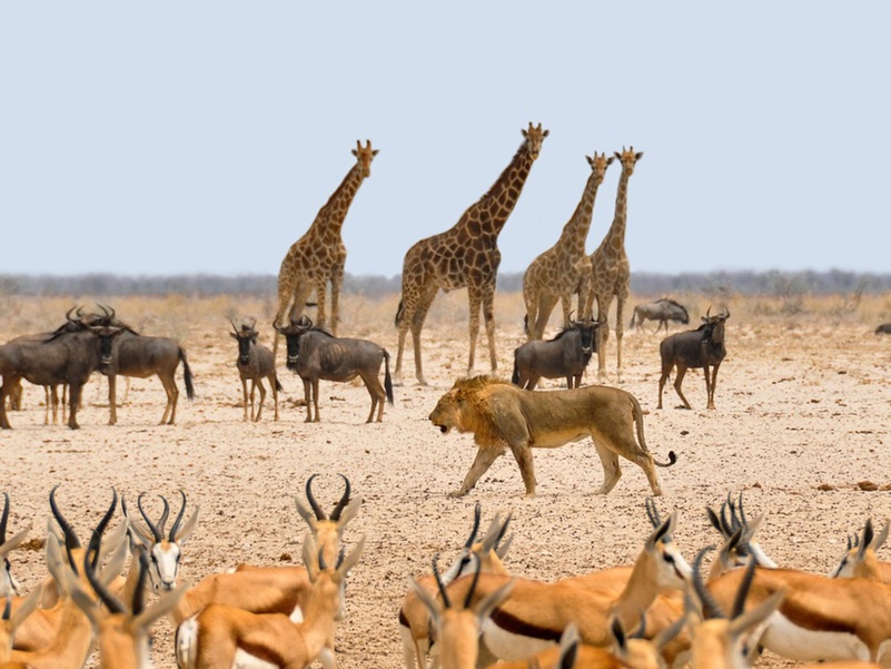 «Место миражей» или «Земля сухой воды» - так звучит в переводе с местного наречия название парка Этоша. И это не случайно – огромная солончаковая чаша из серебристо-белого песка создает эффект миражей под лучами жаркого африканского солнца. Южная часть этой большой чаши окружена различного размера водопоями, куда приходит большое количество животных. А далее начинается настоящий африканский буш с его дикой флорой и фауной. Здесь обитает большое количество слонов, жирафов, различные виды антилоп, зебры, носороги и много хищников – львы, леопарды, гепарды и даже дикие собаки. Также в парке Этоша обитает множество птиц.