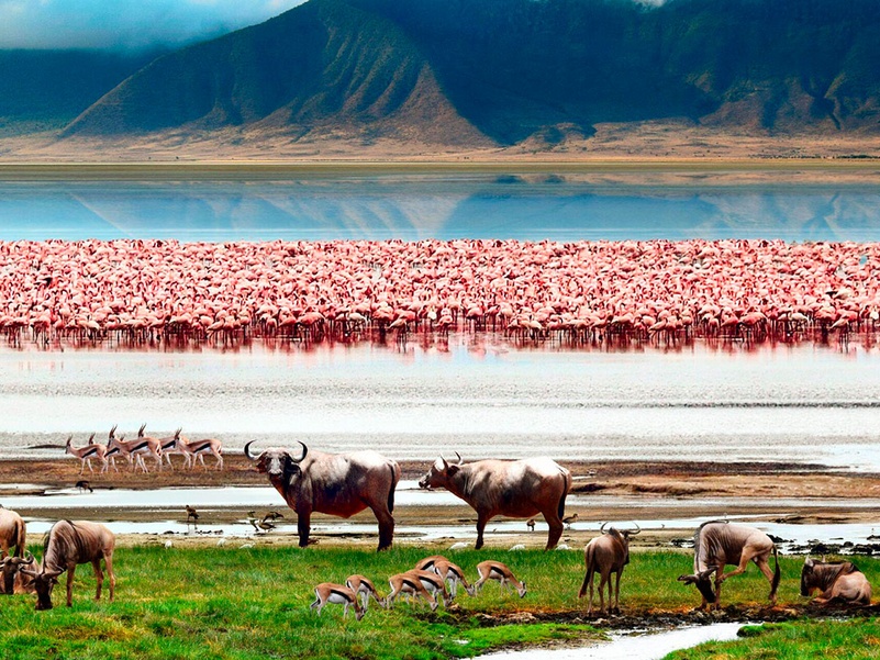 После полудня спустимся на 2000 футов на дно кратера для просмотра игр. Нгоронгоро уникален, так как его физическая защита от естественной красоты человека делает его одним из самых нетронутых уголков дикой природы на земле. Он считается естественным чудом света и внесен в список Всемирного наследия. Это самый большой неповрежденный кратер в мире: глубина 610 метров, диаметр 16 километров и площадь 540 квадратных километров. На дне кратера луга сливаются с болотами, озерами, реками, лесами и горами - все это рай для диких животных, включая самую большую популяцию хищников в Африке. Вулканический кратер битком набит дикой природой, включая всю крупную дичь. Однако его гордость и радость в том, что он остается последним великим убежищем для черного носорога.