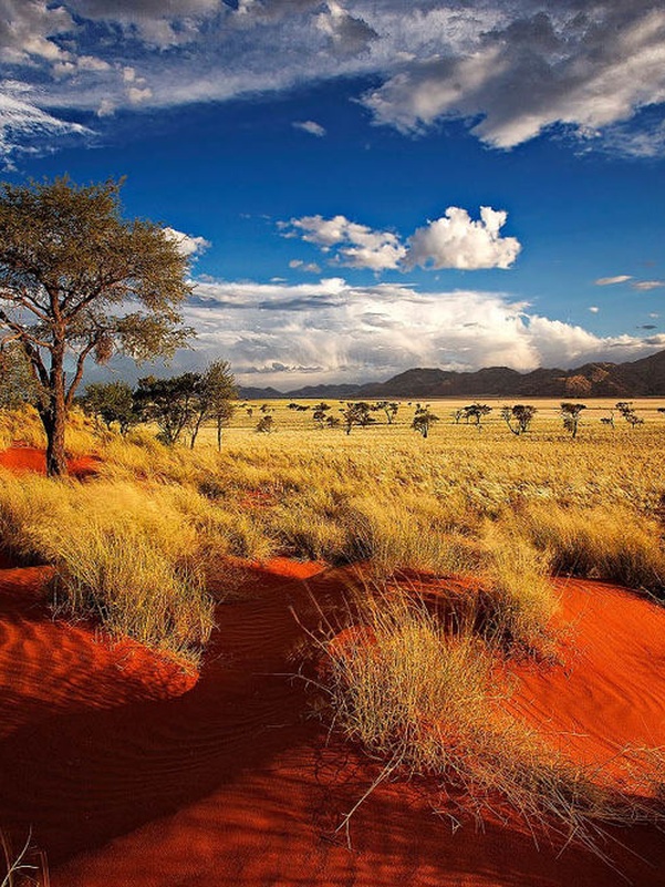 Пустыня Намиб – это самая яркая и важная достопримечательность Намибии. Она создана природой около ста миллионов лет назад, задолго до появления человека на Земле. Протяженность пустыни Намиб более полутора тысяч километров вдоль Атлантического побережья. Намиб подходит вплотную к самому берегу Атлантического океана, это, наверное, один из самых экзотических и длинных диких “пляжей” в мире. Большая часть пустыни является природоохранной зоной и называется национальным парком Намиб-Науклюфт. Здесь встречаются уникальные черные скалы, цветные барханы, красивая серая галька и разноцветные пески. Красные, оранжевые и золотые пески пустыни Намиб-Науклюфт создают неповторимый и удивительный ландшафт, чем-то напоминающий марсианский пейзаж. Здесь практически нет населенных пунктов, лишь пара маленьких поселений и несколько туристических отелей. Пожалуй, это единственное место в мире, где в пустыне можно увидеть дерево, которое умерло еще тысячу лет назад. Намиб – одна из самых засушливых пустынь на нашей планете, растения здесь вынуждены адаптироваться к такому суровому климату, поэтому в Намибии можно встретить деревья и кустарники самых причудливых форм.