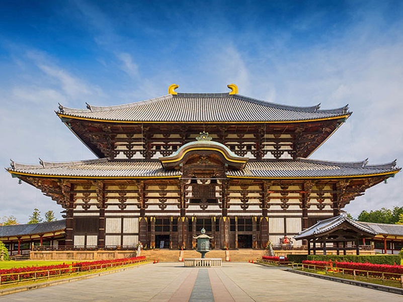 Нара – политический и религиозный центр древней Японии, куда легко доехать из Осаки и Киото. Здесь много святилищ и храмов, которые считаются одними из древнейших в стране. На территории большинства из них разбиты прекрасные цветники. В парке Нара свободно живут знаменитые ручные олени, а в расположенном неподалёку храме Тодай-дзи стоит самая большая в мире бронзовая статуя Будды. В районе горы Ёсино — объекта Всемирного наследия ЮНЕСКО — проходят важные паломнические маршруты. Весной здесь можно любоваться потрясающей красотой цветущей сакуры.- Храм Тодайдзи и парк оленей