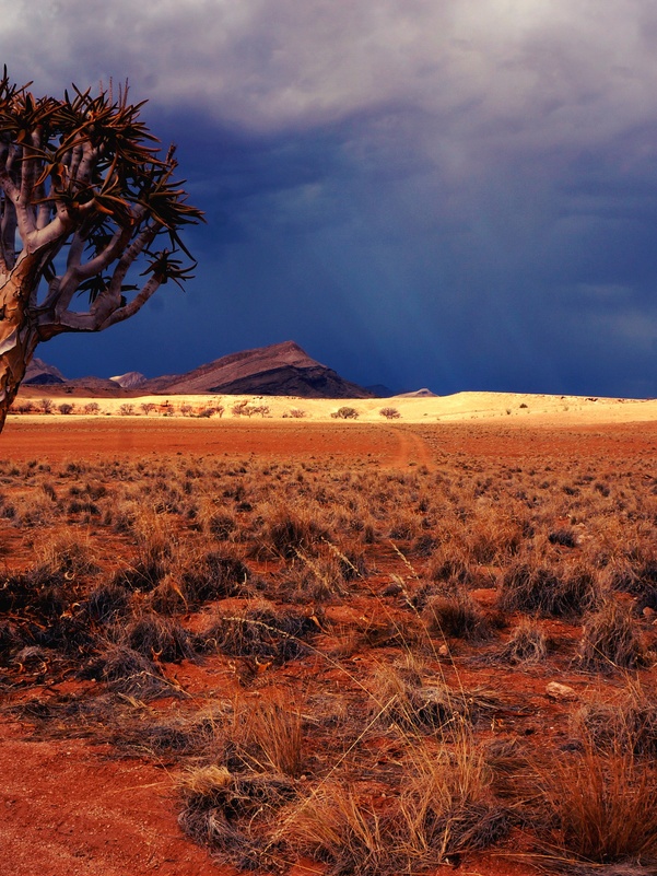 Пустыня Намиб – это самая яркая и важная достопримечательность Намибии. Она создана природой около ста миллионов лет назад, задолго до появления человека на Земле. Протяженность пустыни Намиб более полутора тысяч километров вдоль Атлантического побережья. Намиб подходит вплотную к самому берегу Атлантического океана, это, наверное, один из самых экзотических и длинных диких “пляжей” в мире. Большая часть пустыни является природоохранной зоной и называется национальным парком Намиб-Науклюфт. Здесь встречаются уникальные черные скалы, цветные барханы, красивая серая галька и разноцветные пески. Красные, оранжевые и золотые пески пустыни Намиб-Науклюфт создают неповторимый и удивительный ландшафт, чем-то напоминающий марсианский пейзаж. Здесь практически нет населенных пунктов, лишь пара маленьких поселений и несколько туристических отелей. Пожалуй, это единственное место в мире, где в пустыне можно увидеть дерево, которое умерло еще тысячу лет назад. Намиб – одна из самых засушливых пустынь на нашей планете, растения здесь вынуждены адаптироваться к такому суровому климату, поэтому в Намибии можно встретить деревья и кустарники самых причудливых форм.