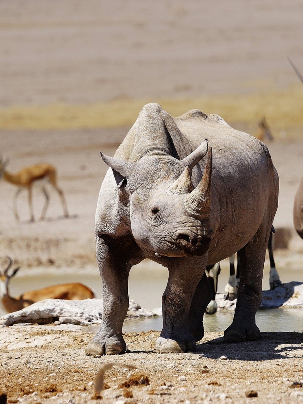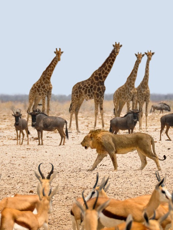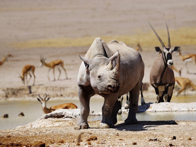 «Место миражей» или «Земля сухой воды» - так звучит в переводе с местного наречия название парка Этоша. И это не случайно – огромная солончаковая чаша из серебристо-белого песка создает эффект миражей под лучами жаркого африканского солнца. Южная часть этой большой чаши окружена различного размера водопоями, куда приходит большое количество животных. А далее начинается настоящий африканский буш с его дикой флорой и фауной. Здесь обитает большое количество слонов, жирафов, различные виды антилоп, зебры, носороги и много хищников – львы, леопарды, гепарды и даже дикие собаки. Также в парке Этоша обитает множество птиц.