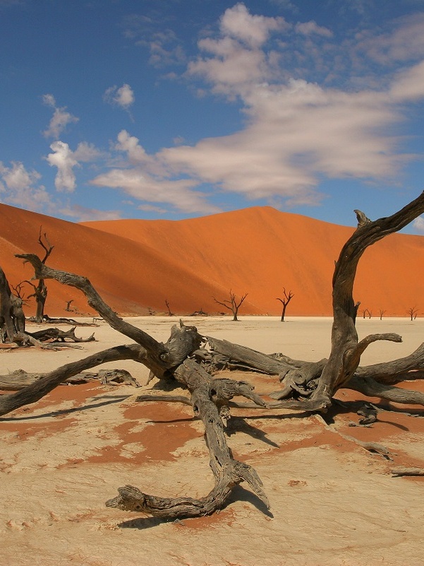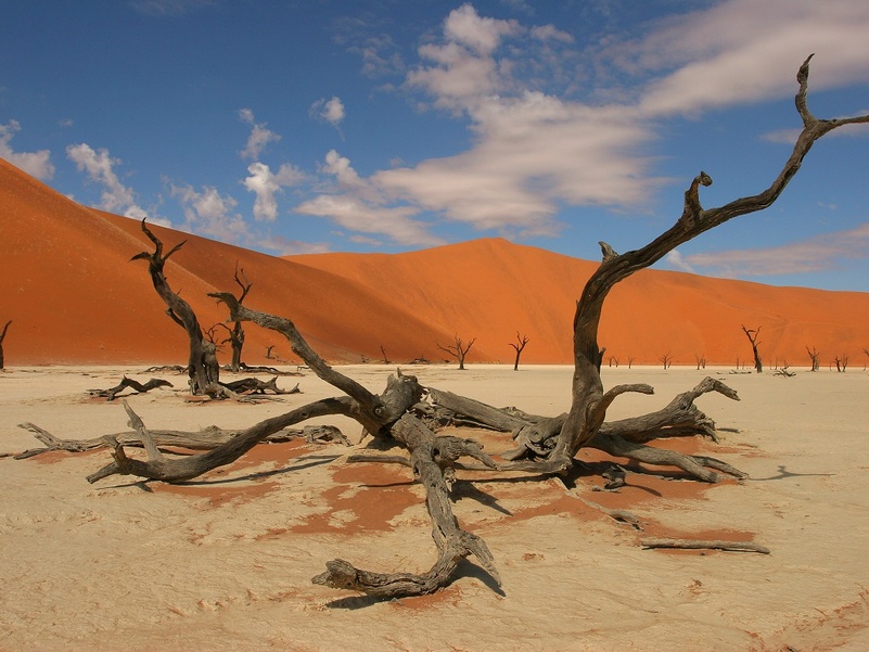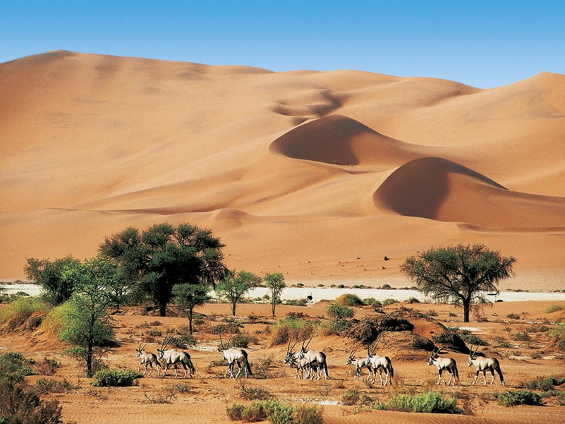 Здесь вы можете подняться на самые высокие в мире дюны, совершить прогулку к «мертвой долине», где увидите на дне белого солончака выжженные ярким африканским солнцем деревья. И все это – в окружении высочайших песчаных оранжевых дюн под синим небом. Величественные красные дюны являются достигают 400 метров в высоту. Краски здешних мест просто поражают воображение – от темно-бордовых, красных, оранжевых на рассвете и закате до золотистых и розовых оттенков песков днем. Белые солончаки и мертвые деревья в «Долине смерти» на фоне кристально-чистого синего неба останутся в вашей памяти на всю жизнь. А в сезон дождей на плато Соссусфлей красок становится еще больше, наливаются реки, зеленеют деревья. Здесь снято огромное количество красивейших фотографий и фильмов, которые демонстрируют удивительные красоты африканского континента.