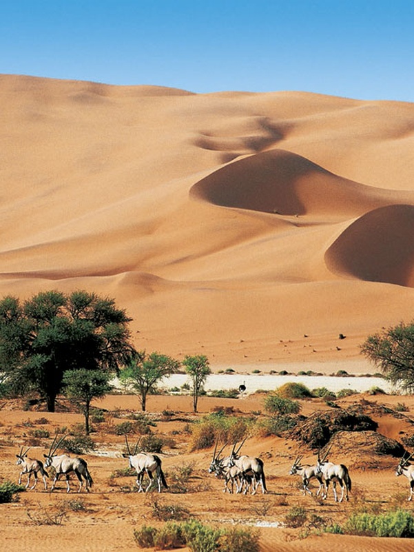 Пустыня Намиб – это самая яркая и важная достопримечательность Намибии. Она создана природой около ста миллионов лет назад, задолго до появления человека на Земле. Протяженность пустыни Намиб более полутора тысяч километров вдоль Атлантического побережья. Намиб подходит вплотную к самому берегу Атлантического океана, это, наверное, один из самых экзотических и длинных диких “пляжей” в мире. Большая часть пустыни является природоохранной зоной и называется национальным парком Намиб-Науклюфт. Здесь встречаются уникальные черные скалы, цветные барханы, красивая серая галька и разноцветные пески. Красные, оранжевые и золотые пески пустыни Намиб-Науклюфт создают неповторимый и удивительный ландшафт, чем-то напоминающий марсианский пейзаж. Здесь практически нет населенных пунктов, лишь пара маленьких поселений и несколько туристических отелей. Пожалуй, это единственное место в мире, где в пустыне можно увидеть дерево, которое умерло еще тысячу лет назад. Намиб – одна из самых засушливых пустынь на нашей планете, растения здесь вынуждены адаптироваться к такому суровому климату, поэтому в Намибии можно встретить деревья и кустарники самых причудливых форм.