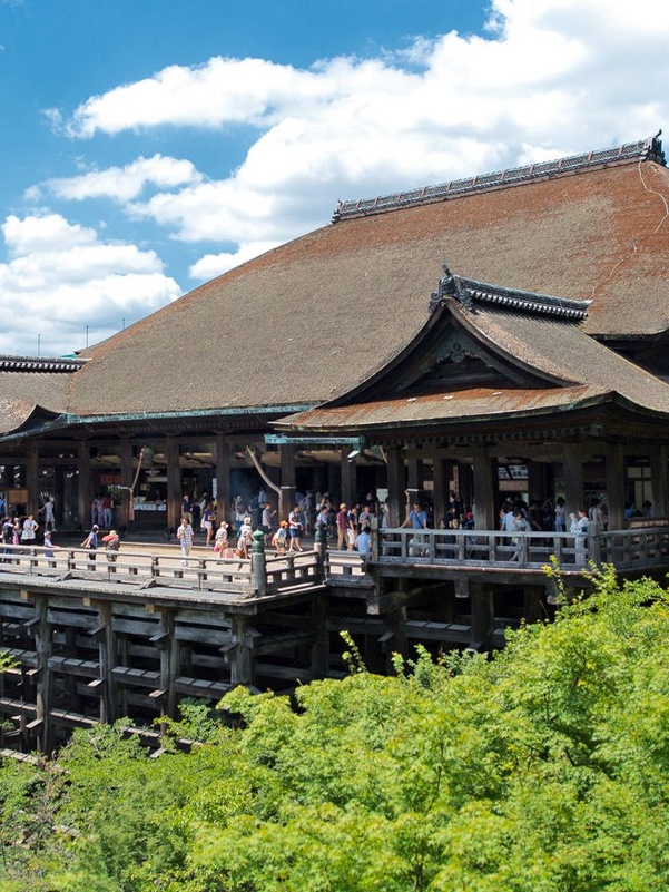 Храм расположен на склонах горы Хигасияма (Восточная гора). Основан в 778 году. Храм знаменит своей необычной конструкцией: он стоит на склоне высокого холма и как бы "спускается" по этому склону своими деревянными сваями, построен без единого гвоздя.