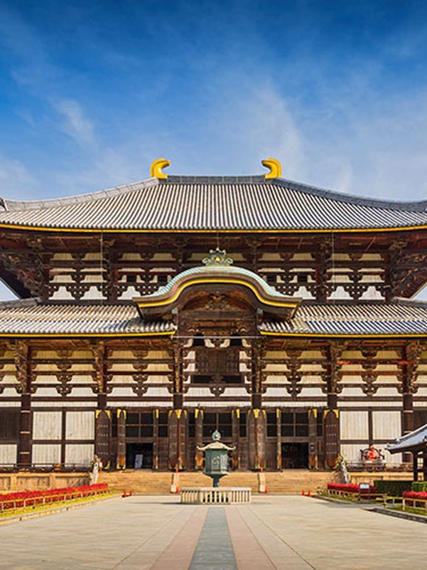 Нара – политический и религиозный центр древней Японии, куда легко доехать из Осаки и Киото. Здесь много святилищ и храмов, которые считаются одними из древнейших в стране. На территории большинства из них разбиты прекрасные цветники. В парке Нара свободно живут знаменитые ручные олени, а в расположенном неподалёку храме Тодай-дзи стоит самая большая в мире бронзовая статуя Будды. В районе горы Ёсино — объекта Всемирного наследия ЮНЕСКО — проходят важные паломнические маршруты. Весной здесь можно любоваться потрясающей красотой цветущей сакуры.- Храм Тодайдзи и парк оленей